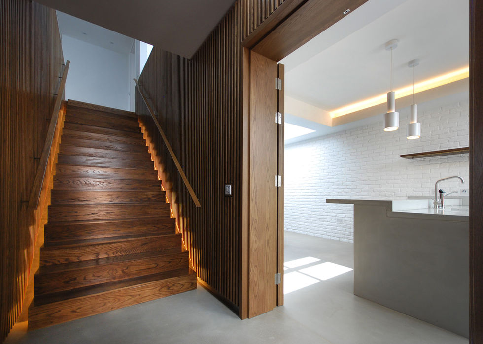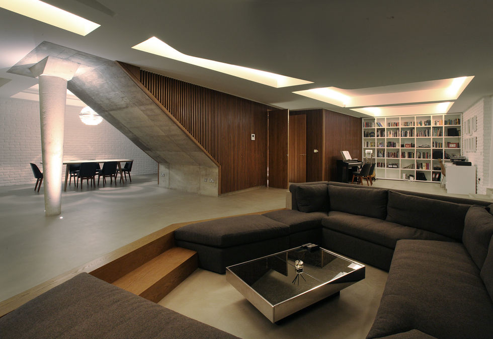 Illuminationworks was employed to develop a lighting design for this new build residence that aesthetically fits with the exposed, raw architectural elements. Low level lighting is utilised throughout to add to the relaxed atmosphere required. Unique features are highlighted, such as an exposed structural column that supports the stair and acts as a focal point to the reception areas. Ceiling coffers are uplit with linear cove lighting to outline the geometric pattern of the ceilings. The beautiful enclosed stair is gently uplit from a reveal detail at each side of the treads.